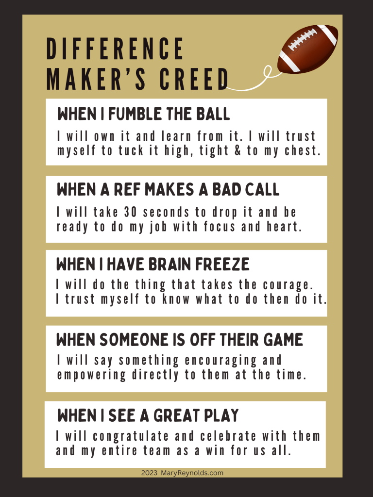 One more story … As you may remember, I’ve mentioned this week that I got to give my GREATNESS EXERCISE and do our “I Make A Difference” wristband acknowledgment exchange with my son’s football team, where he’s the head coach. It’s his first year with this bunch, and the game plan he and his coaching staff came up with is all about one thing: Culture Wins. I’ve also mentioned that I’ve done this exercise with over 20,000 people in a two year period so I thought I’d seen it all! But here’s the thing that happened with my son’s football team that had never happened before that brings tears to my eyes, even as I write this. In Step 4 when I called up two volunteers to demonstrate how to introduce themselves by their greatness neither young man had yet come up with three adjectives to describe what was great about themselves – to then introduce themselves by. I looked out to the group of bright, eager, strapping high school football players and they were on the edge of their chairs. With a little nod of permission by me, they started yelling out what was great about each of the two players. I then had each player repeat back – out loud – what their greatness’s were. By the time the team got through with them there were 8-10 for each player! The caring engagement between the team and the two guys up front with me was off the charts as each player started to own their greatness. Goosebumps! Then, after everyone introduced themselves by their greatness and we had the wristband exchange we moved on to creating their team’s Difference Maker’s Creed. Difference Maker’s Creed